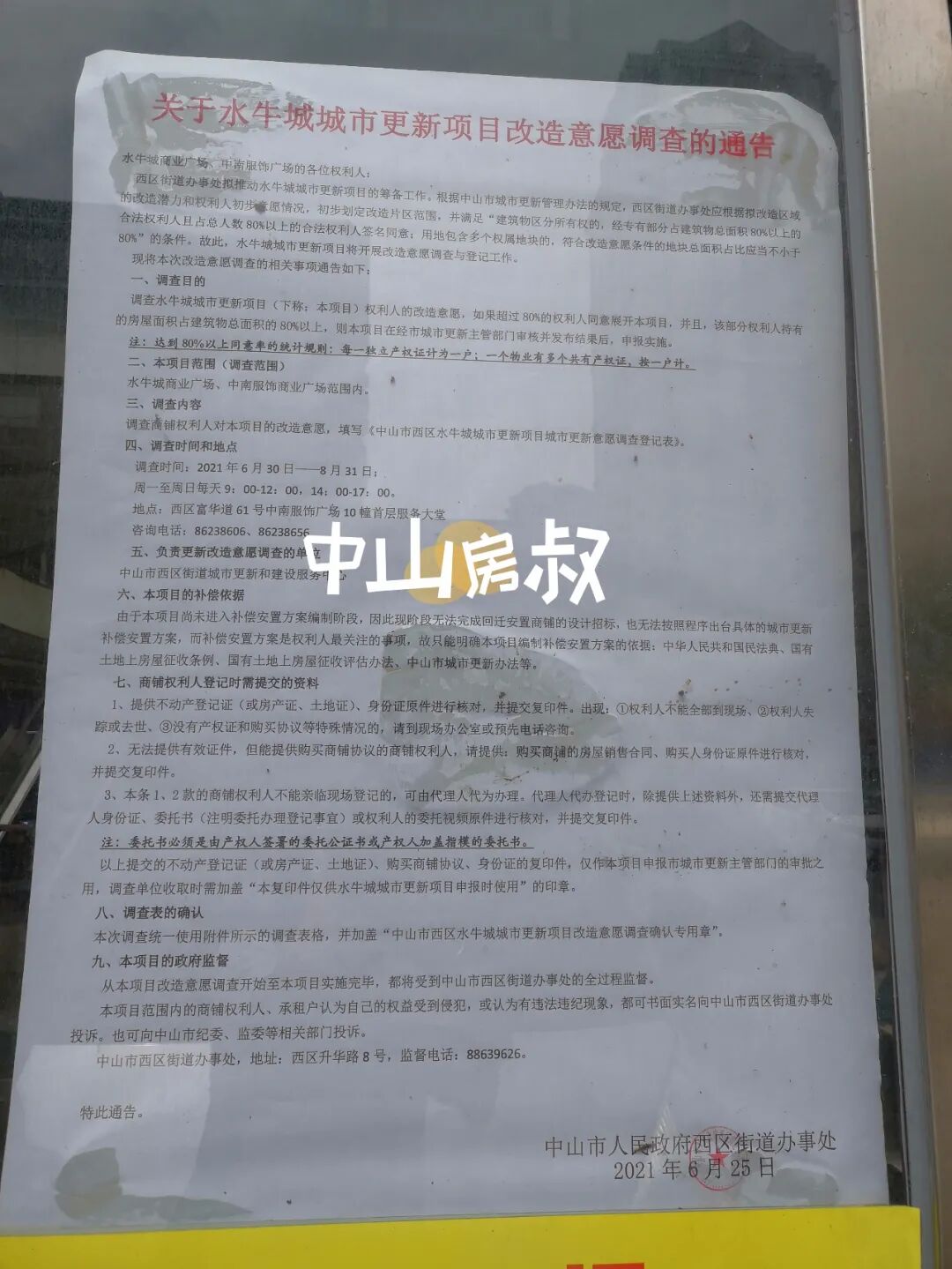 早在今年6月30日,中山日报就已发布了西区水牛城项目改造意愿调查公告。
