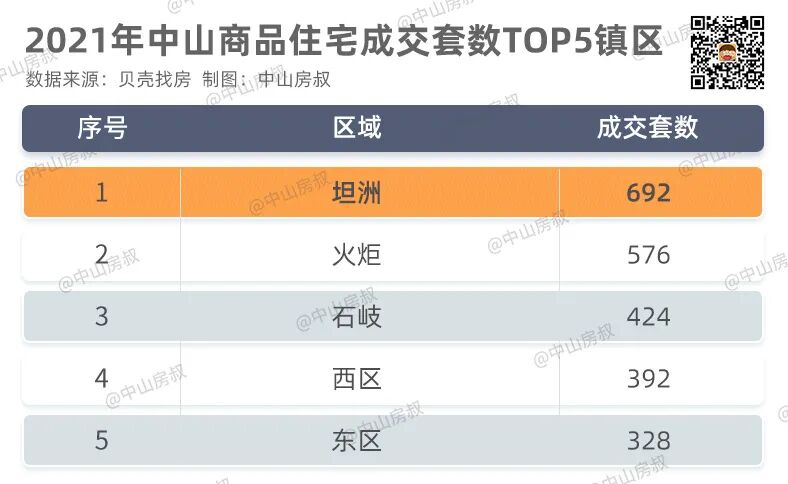 从成交前五甲来看,坦洲(692套)、火炬开发区(576套)、石岐(424套)、西区(392套)、东区(328套)既是二手房供应大户,又是大部分人会选择的区域。