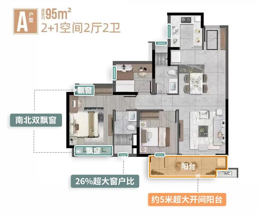 项目约95、115、135平三大神户型,全部户型做到了主套房南北双飘窗。