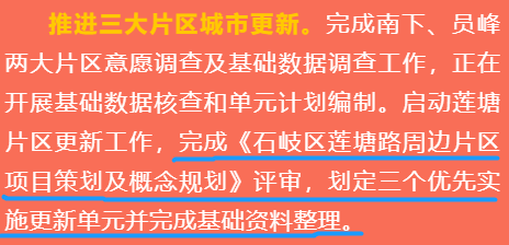 去年年底,计划启动莲塘片区更新工作,完成《石岐区莲塘路周边片区项目策划及概念规划》评审,划定三个优先实施更新单元并完成基础资料整理。