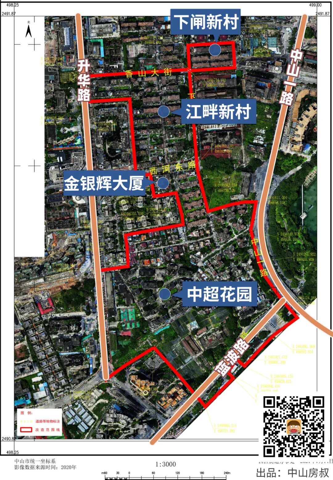 其东至香山酒店、凯旋时代公寓、中山一路、下闸路,南至岐江河,西至升华路、名仕经典世家小区,北至亚洲广场、香山大街。