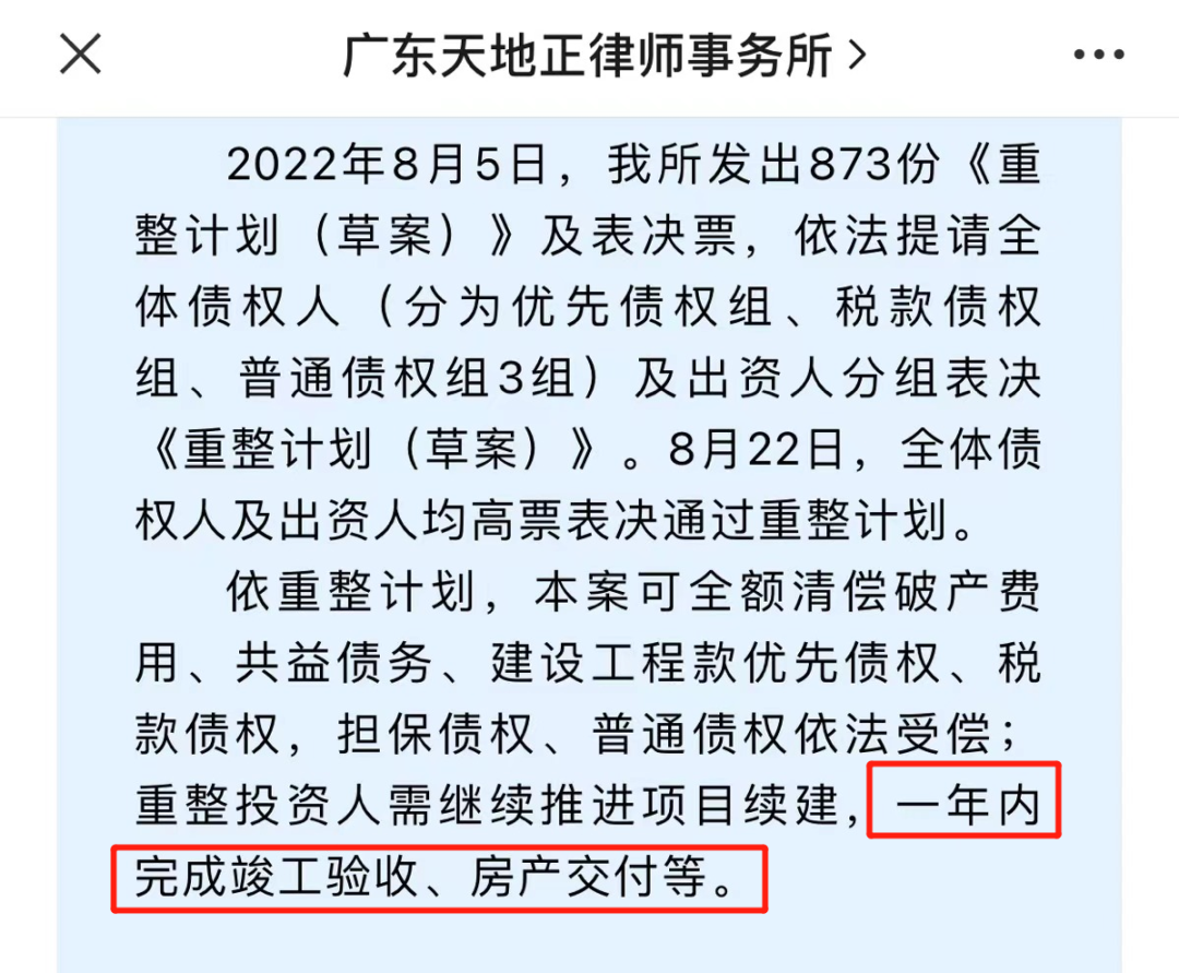 一个月后,重整方案正式出炉,全体债权人及出资人均高票表决通过重整计划,项目从破产清算转为重整续建,续了一口命。