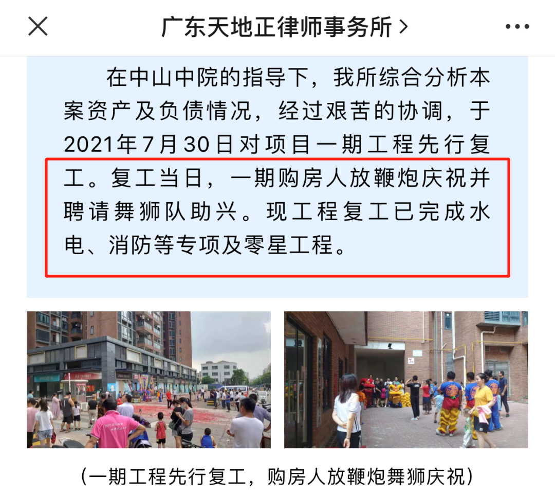 但好在重整方案有序推进,在2021年7月,项目一期工程先行复工,目前工程复工已完成水电、消防等专项及零星工程。
