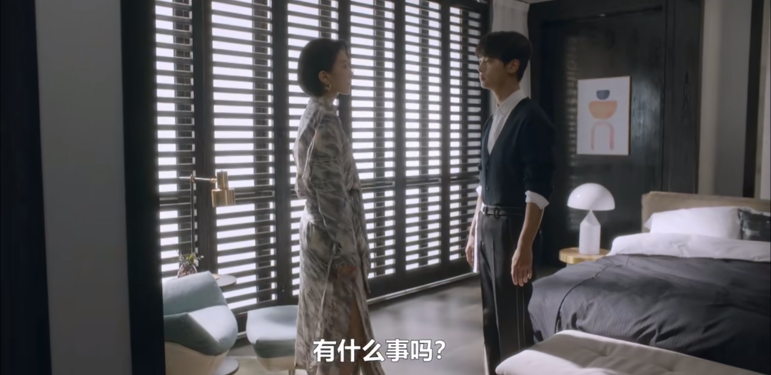 少爷和后妈瑞贤的冲突也在第5集更明显了。两人对手戏的2场戏,画面都用了密集的横条、竖条当做主要背景,光源都被阻断了。两人位置关系也是一正一反的交错。
