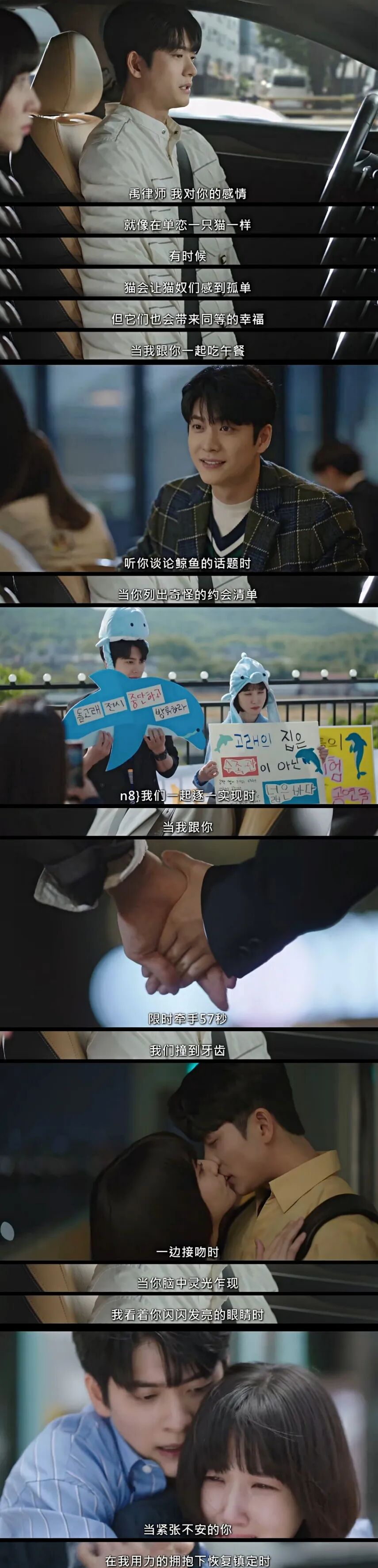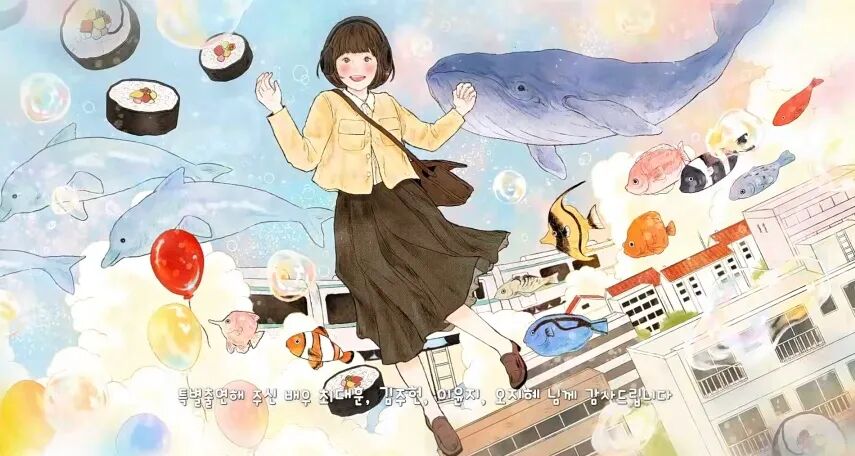 相比较一开始,英禑紧闭着眼睛、肩膀蜷缩、紧握双手、视线朝下方的局促模样。现在的英禑表情、肩膀和手指都舒展了许多,也能抬起头自然地平视前方,三脚、春三、福顺、江豚和虎鲸朋友出现了,小鲸鱼的上班路不再孤独。