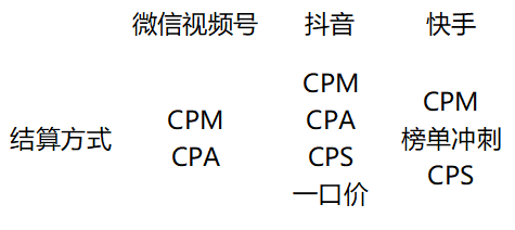 对比抖音和快手的达人营销计划,视频号小任务的结算方式也较为单一,暂时只支持CPM和CPA两种结算方式