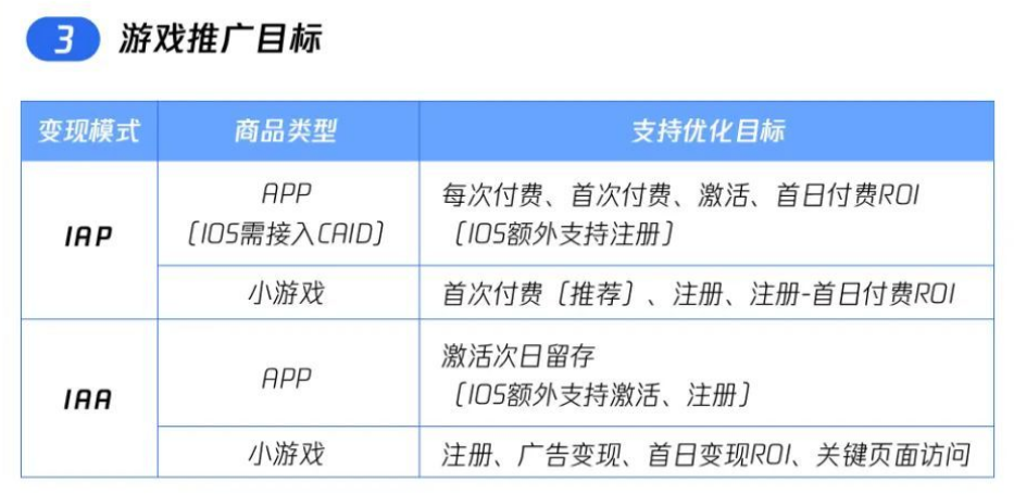 具体的转化链路和熟悉的买量相同,应用可以通过中间页跳转下载、小游戏可以直接从短视频内容唤起。投放计划的目标也相对完善,包括内购小游戏也支持首次付费的优化目标,对一些中重度的小游戏会有更稳定付费ROI效果。