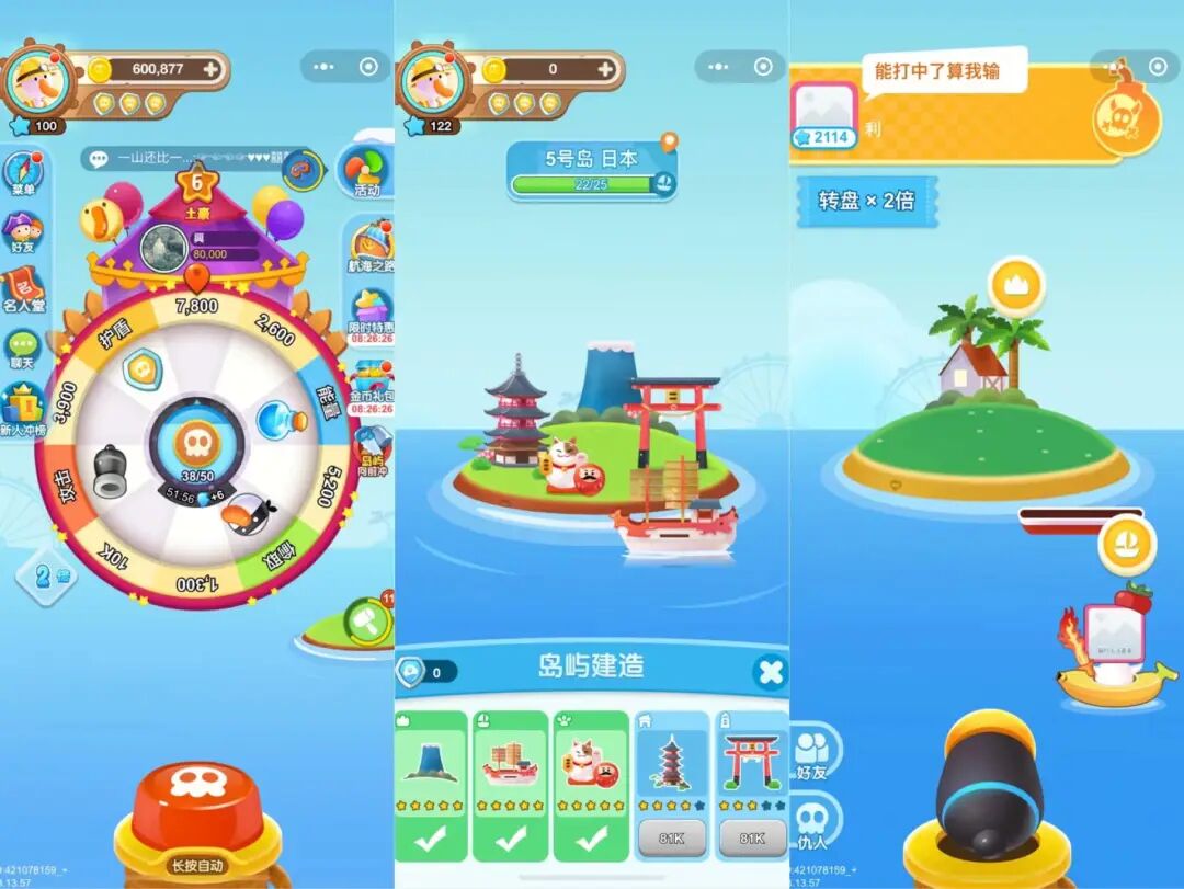 这款小游戏的主要玩法由转盘、建造岛屿、偷取或攻击其他玩家的岛屿组成,在玩法上可以算是「有手就行」。同时,游戏还有好友间互送道具、组队挑战、帮助好友复仇等多种社交玩法,鼓励玩家在游戏内大量添加好友并与好友互动。由此,游戏通过玩法和奖励机制的推动,表现出了很强的社交导向。