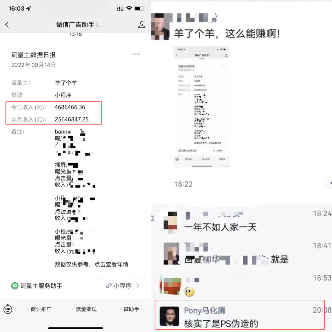 两天后,网上流传出一张截图,称《羊了个羊》小程序9月14日收入达到468万余元,本月收入高达2565万余元。此事在网络上掀起了一波激烈的讨论,有人质疑游戏离谱的关卡难度设计是为了迫使人多看广告以便牟利,并因此对游戏加以诟病。随后,腾讯董事长马化腾在相关朋友圈下评论,称已核实图片是PS伪造的。《羊了个羊》制作团队也接受了媒体采访,回应称「图片是假的。我们游戏为了用户体验,没有加Banner广告和插屏广告,所以收入的截图根本不对,而且火的时间也凑不够这个总收入。」