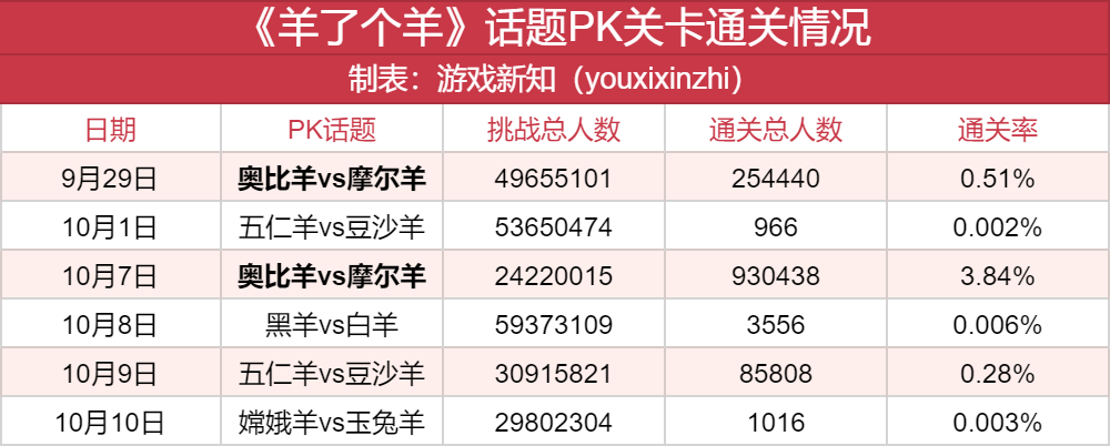 IP联动再加上话题PK带来的胜负欲,都对玩家形成了新的吸引力,提升了游戏的可玩性。联动的PK话题关卡似乎也在难度上进行了调整,并且波动较大。按照玩家参与次数统计,9月29日「奥比羊vs摩尔羊」的通关率约为0.5%左右,而第三次也是最后一次「奥比羊vs摩尔羊」话题PK,通关率则来到了3.8%,与游戏宣传的不足0.1%相比已经产生较大的差距了。除开联动话题PK以外,平时的普通话题PK关卡的通关率也有很大浮动。