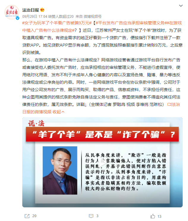 《羊了个羊》还频繁出现在社会新闻里,如女子沉迷羊了个羊丈夫报警求助,还有一位玩家因为轻信了游戏广告中的贷款信息被骗了9万元。后者还引起了对于游戏内的广告投放是否该得到监管的讨论,官方媒体也参与其中,多少对游戏本身造成了一些负面影响。游戏制作团队未对事件做出任何回应,这一轮讨论的热度也很快就过去了。