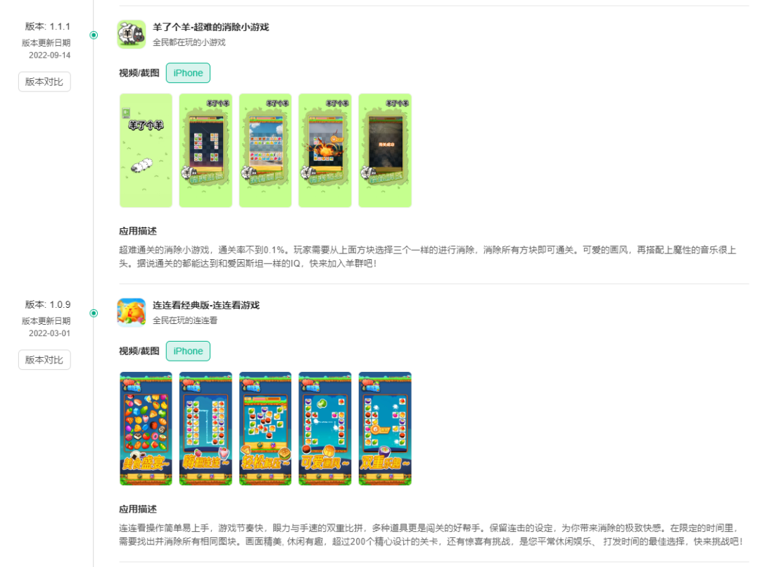 此外,还有许多与《羊了个羊》完全无关的游戏使用与《羊了个羊》相近的画面或文案素材投放广告,借机导量。这些小游戏的类型,从猜成语、模拟经营到休闲小游戏合辑类的应用,各种各样、应有尽有,但游戏本身都和《羊了个羊》没啥关系。