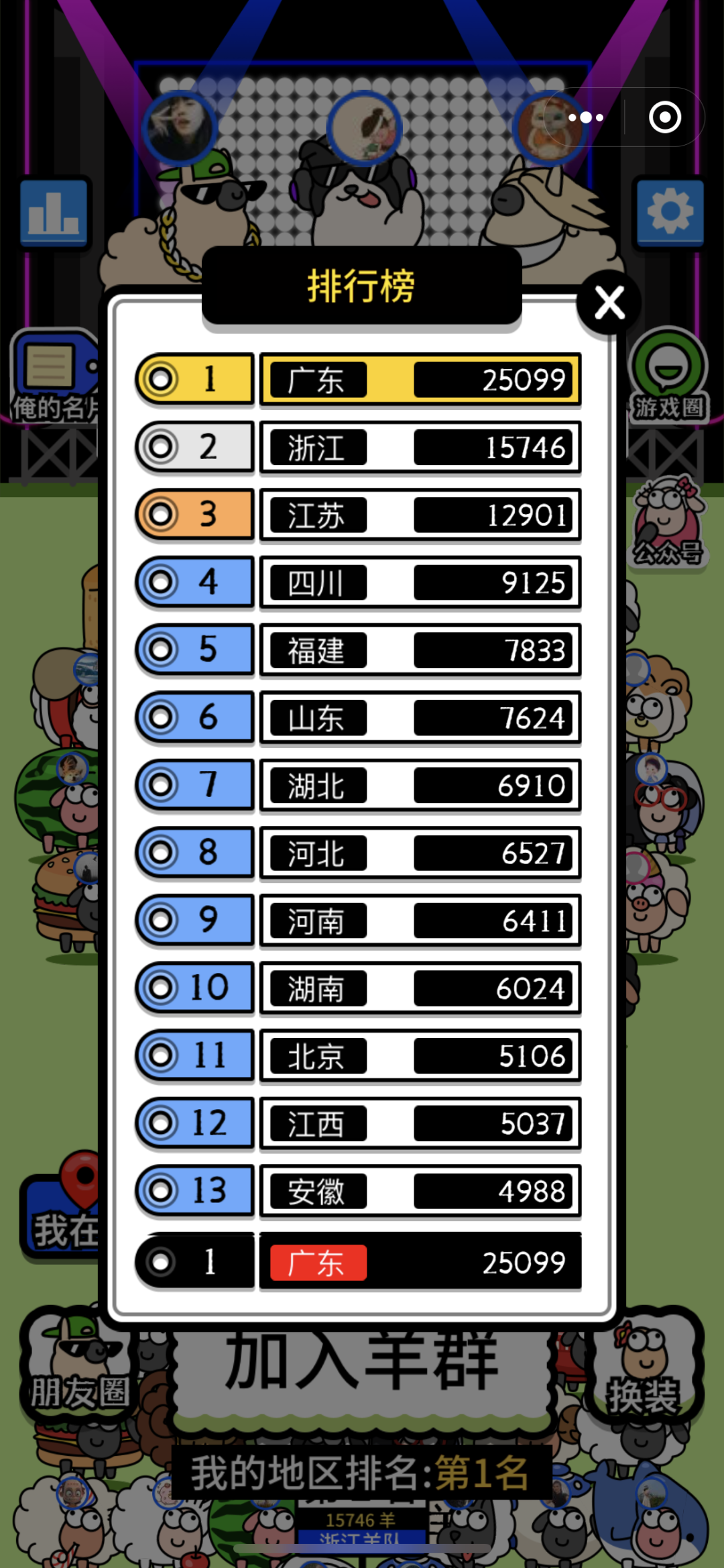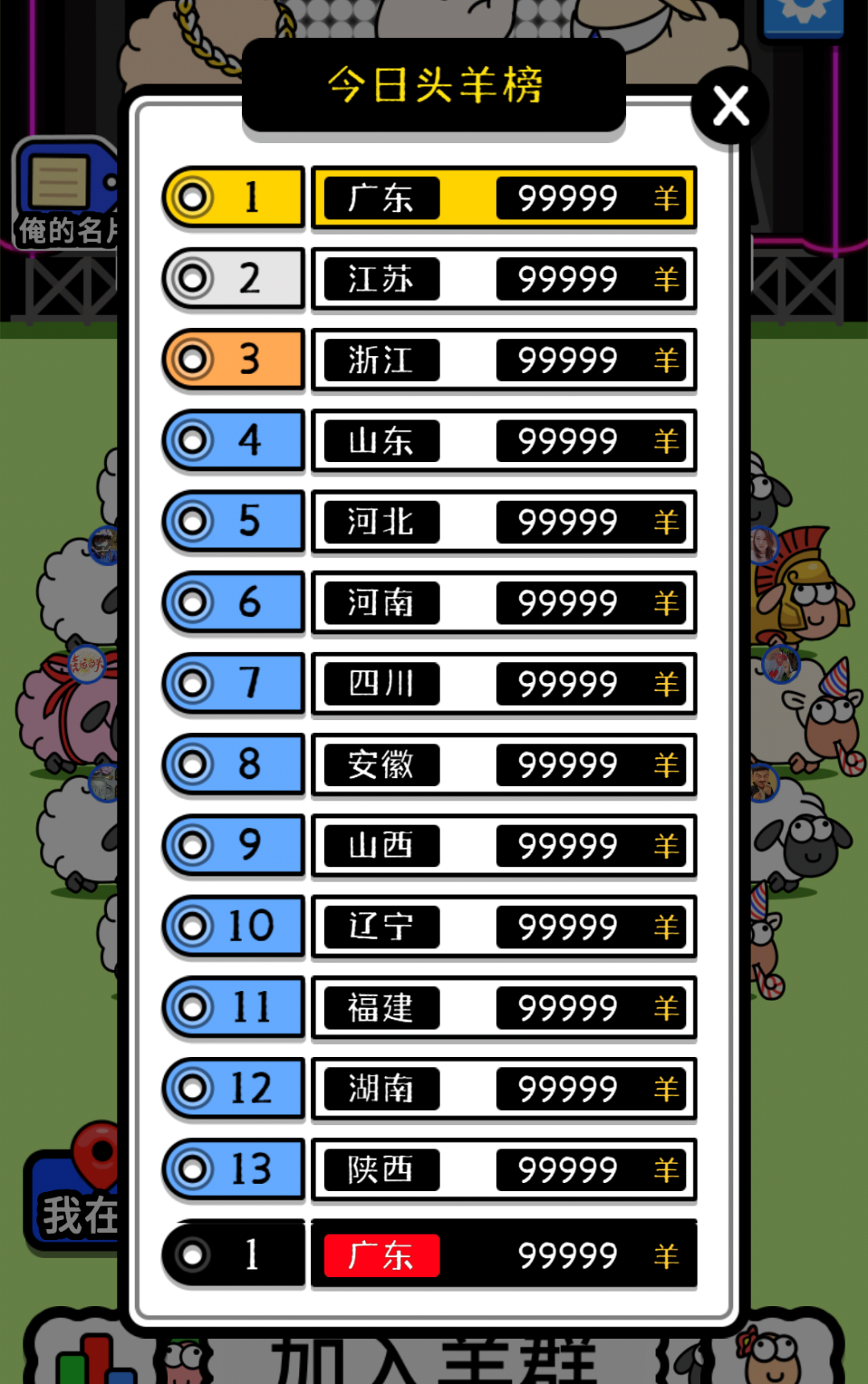 除此之外,游戏还引入了地域排名的系统,让玩家「上头」的理由又增加了一个。玩家通关所要追求的目标除了「万里挑一」的快感,还多了「为家乡争口气」的集体荣誉感。至此全部的玩家心理,算是被《羊了个羊》拿捏得清清楚楚。