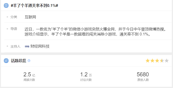 从舆论传播的角度来看,最强的一波热度还是最开始的「通关率不到0.1%」的难度噱头,属于《羊了个羊》主动做出的营销行为,当时的「羊了个羊第二关」等类似的微博热搜也都属于这一次造势。这一波宣传利用大家的好奇心理,迅速铺展开了第一批用户基础,并借助群众自发的吐槽行为发酵热度。《羊了个羊》由此开始进入大众的视野。