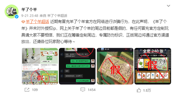 来凑热闹的也有心怀不轨之辈,电商平台和生活分享平台上出现了大量游戏相关的盗版周边。9月21日,《羊了个羊》官博还专门对这些现象进行了回应,提醒大家不要上当。这条微博还同时宣布将会制作官方周边,算是顺便做了一小波宣传。