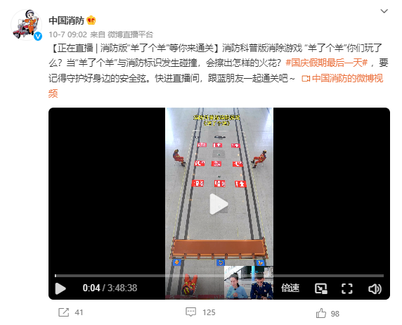 连中国消防官博也来凑了个热闹,前后直播了三场消防标识科普版的《羊了个羊》。