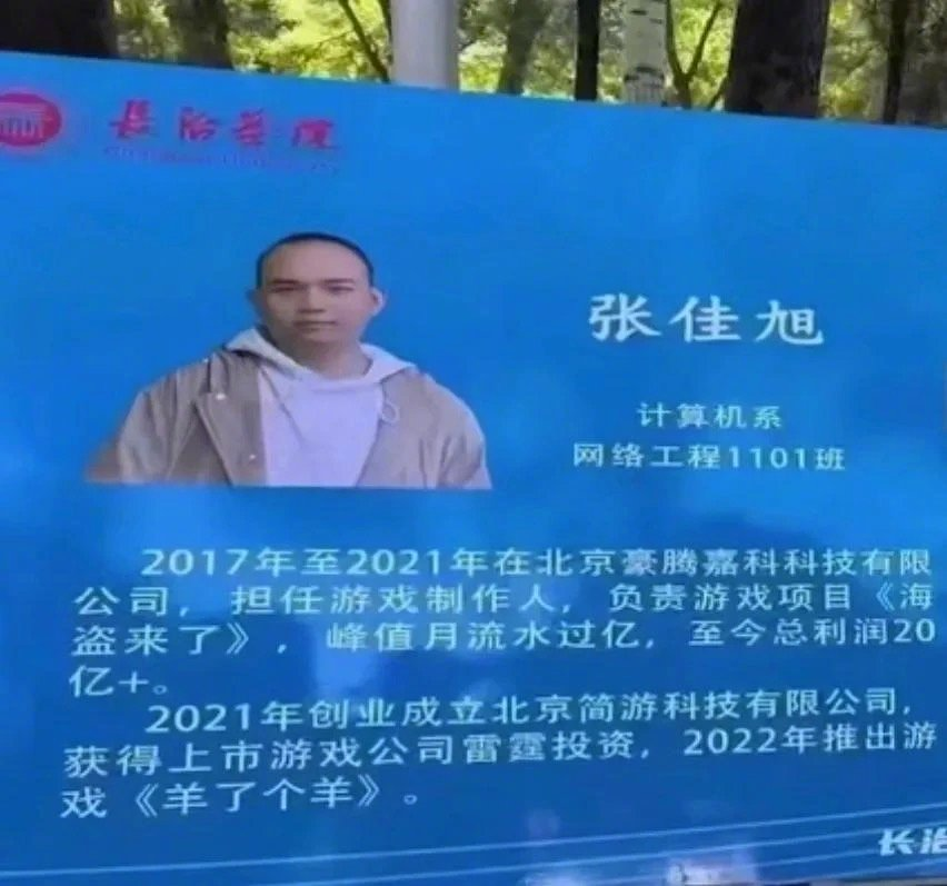所谓「现象级」,大致就是这样的状况吧。《羊了个羊》制作团队CEO张佳旭,其母校长治学院还在校内放置了一块长2米、高1.5米的大型展牌,专门介绍「毕业生张佳旭」的成绩,俨然已经将他当做一个「母校的荣耀」了。