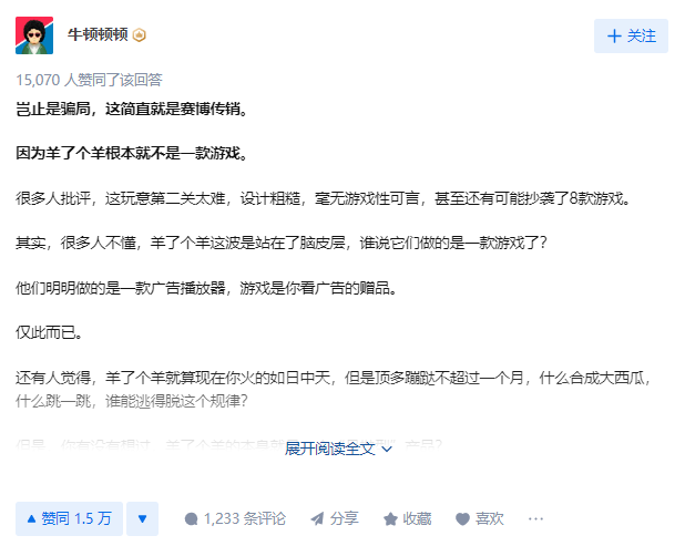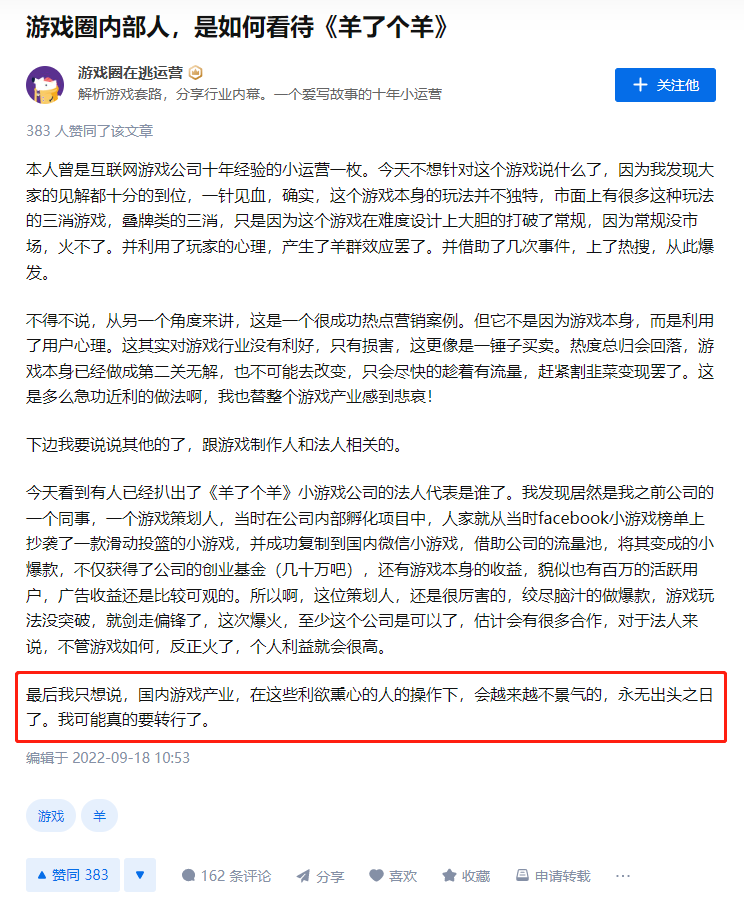 在游戏从业者之间,《羊了个羊》可以说是招致了一片骂声。知乎上有不少同行发表了自己的见解。有从个人感情角度出发的: