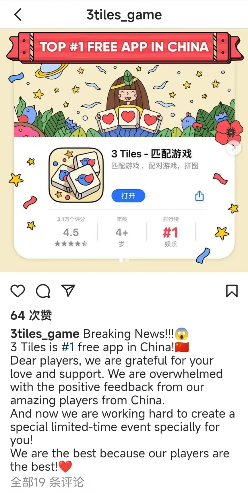这对于《3 Tiles》来说显然始料未及,游戏的海外官方账号甚至更新了一条推文,宣布要为中国玩家打造一个特别的限时活动。