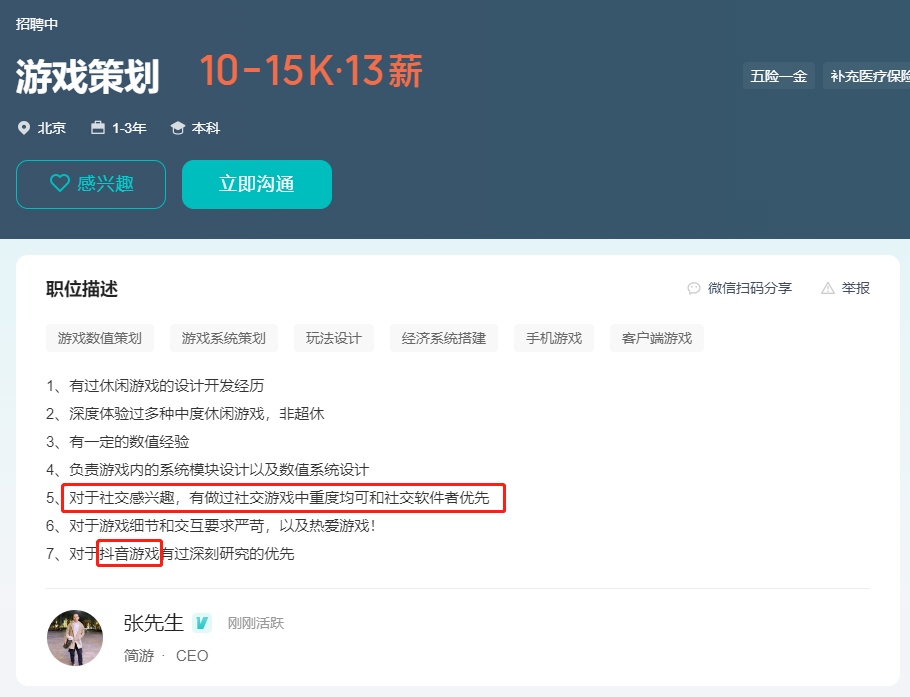 对于张佳旭和他的团队来说,至少他们似乎仍打算继续探索这一市场。根据北京简游在BOSS直聘平台上发布的招聘信息,公司接下来可能要继续在社交游戏上发力,并且尝试探索抖音游戏的可能性。
