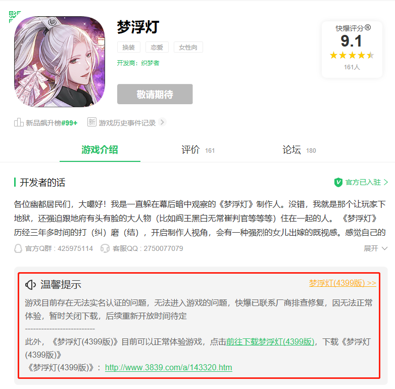 尽管游戏官方均未发布停服相关的公告,但不少游戏玩家其实均已做好了心理准备。2019年《晨曦列车》下架之后,官方在2021年9月创建了下载游戏包体的粉丝群;今年4月份的时候,不少《梦浮灯》的玩家反馈未能通过实名认证,好游快爆专门提供了4399版本。