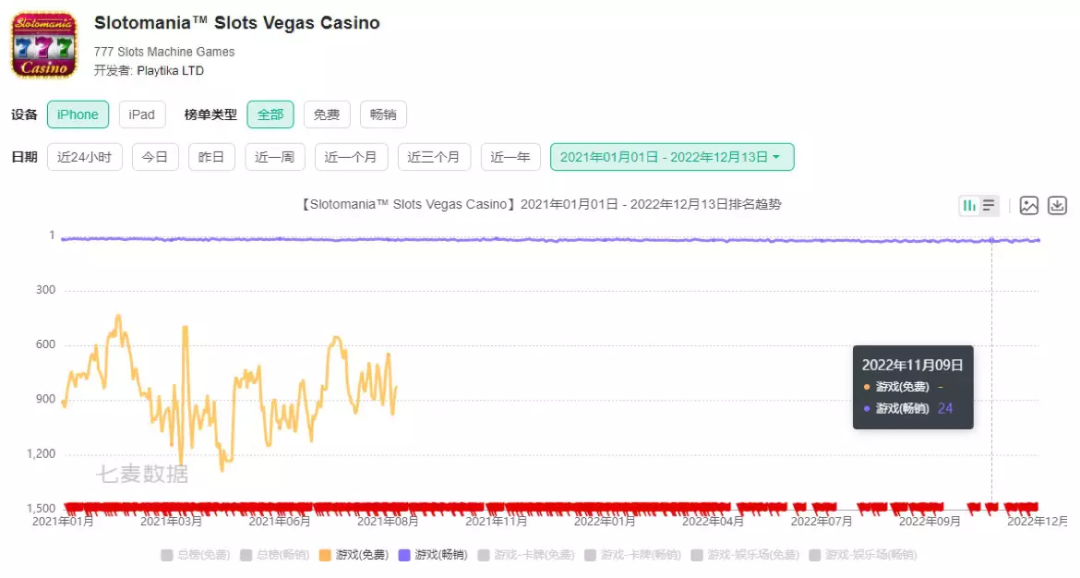实际上Playtika并不缺能够支撑长线运营的产品,只是苦于缺少新的增长点,无法稳固优势地位。Playtika旗下的业务主要有两方面,分别是起家的棋牌社交类和后来发展的休闲类。在整个2021年里,分别位于这两个品类头部位置的《Slotomania》和《Bingo Blitz》为Playtika带来了约一半的收入。在近两年里,这两款游戏也一直稳定在美国iOS畅销榜的前30名。