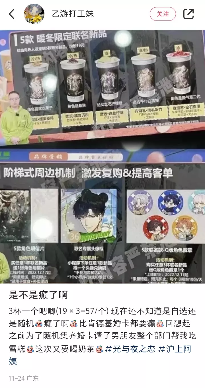 然而在11月24日,有关本次联动活动的实施方案截图在网络上流传,其中「购买3杯联名款饮料随机赠送一款吧唧」这一不够合理的活动机制,引起了网友们的热议和不满。