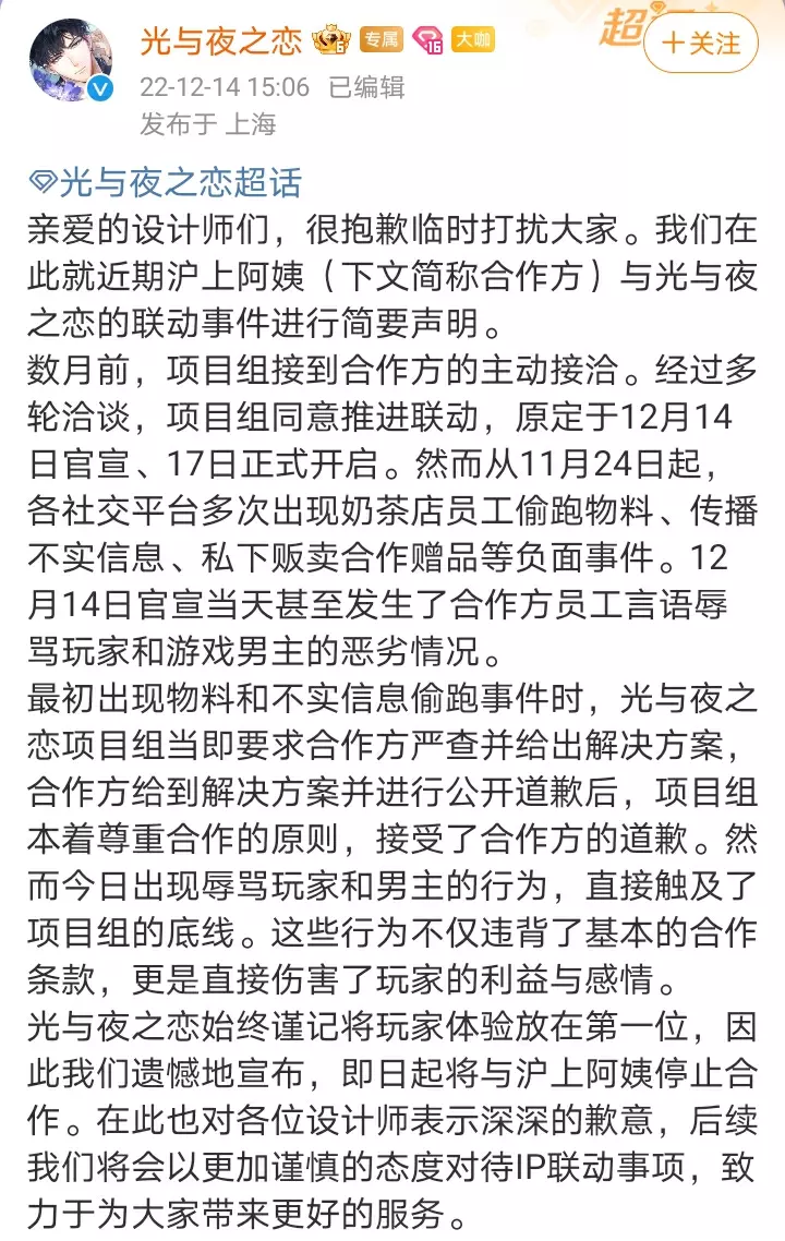 12月14日,《光与夜之恋》官方发布微博,因合作奶茶店品牌沪上阿姨部分员工存在泄露物料、私自售卖联动赠品、辱骂游戏及玩家等负面行为,即日起停止与沪上阿姨的合作。