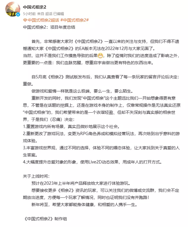 ,《中国式相亲2》官方在微博发布项目年终总结,称《中国式相亲2》的EA版本无法在2022年12月推出。