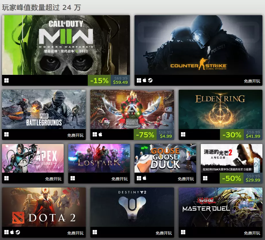 「最热玩游戏」中玩家峰值数量超过24万的有以下游戏:
