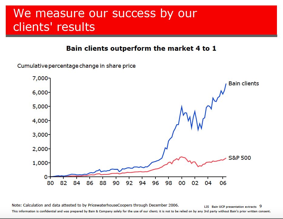 贝恩公司的PPT主要用红色贯穿前后。除了红色之外,还搭配了浅灰色,黑色两种无彩色。浅灰作为辅助色,黑色则起到了点缀的作用。