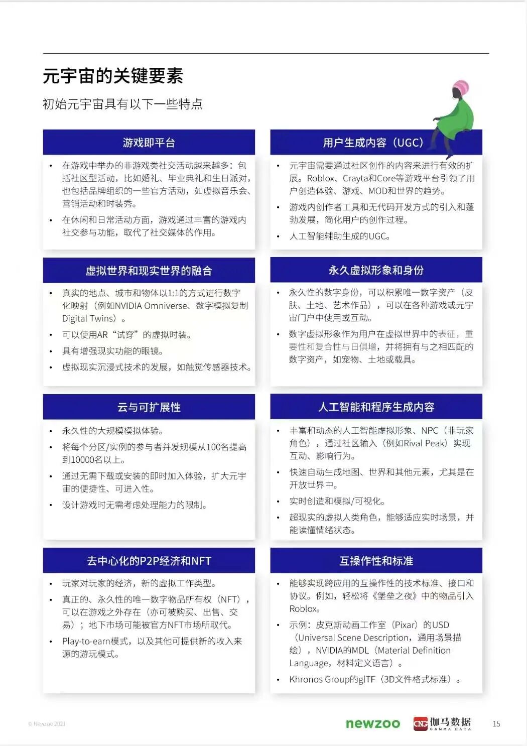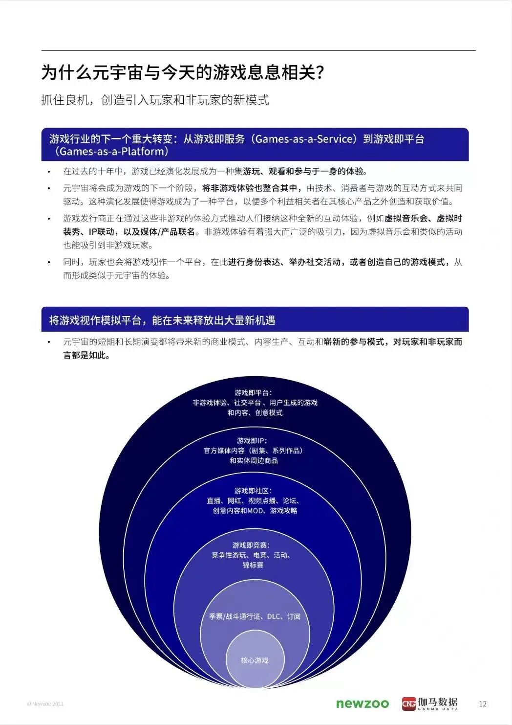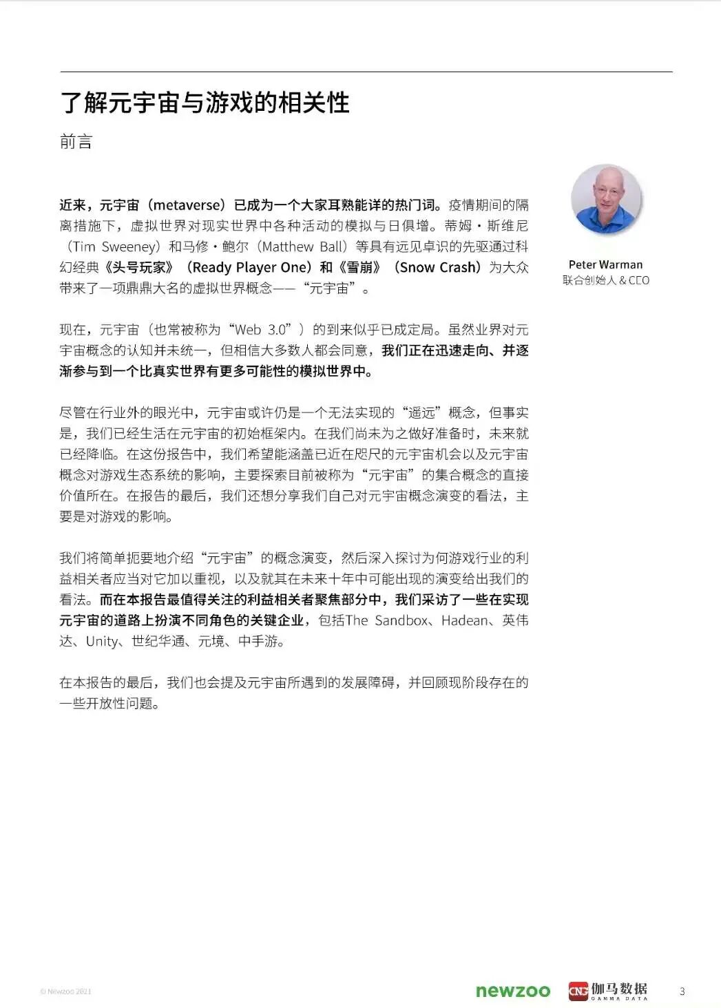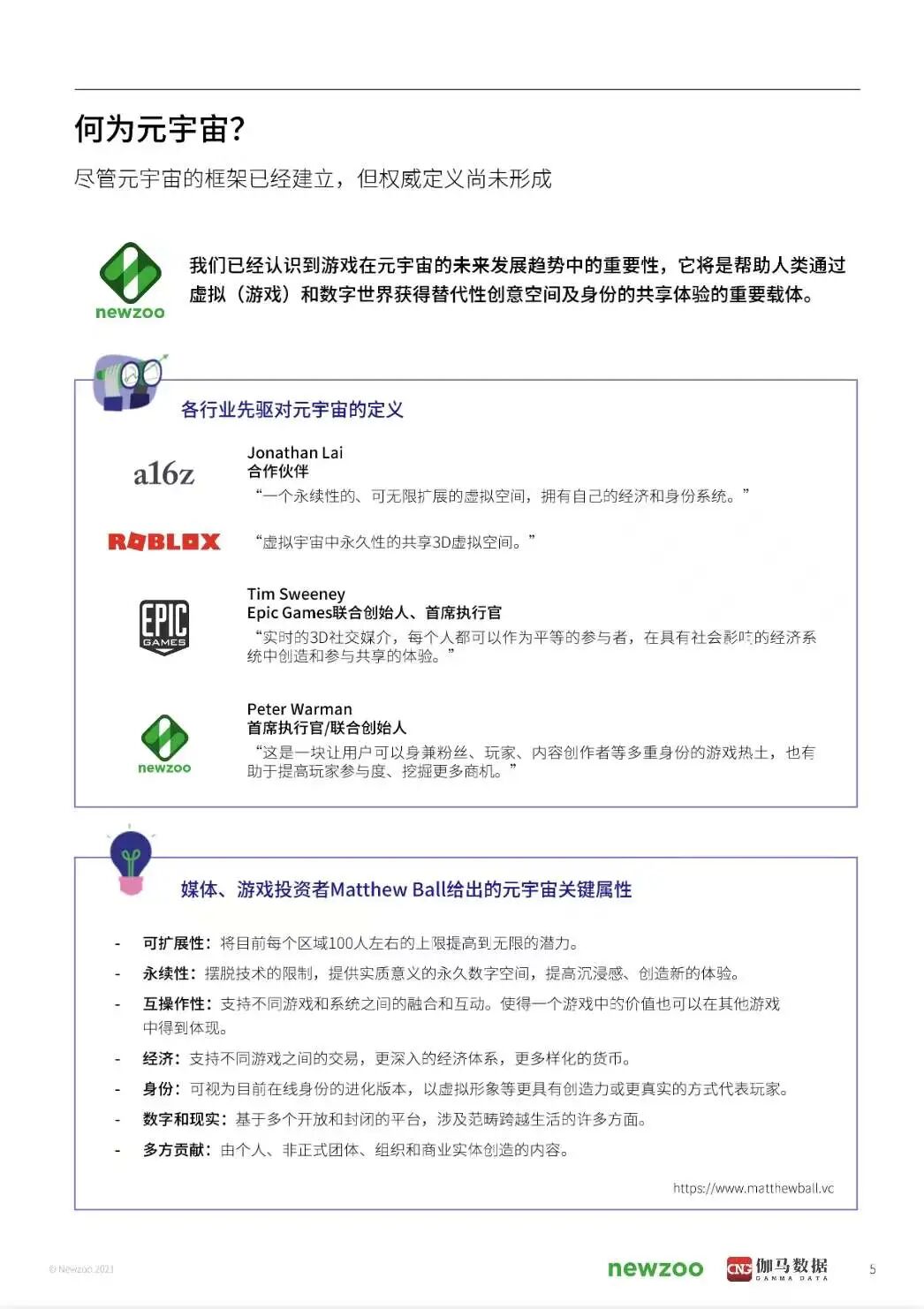 本报告将简单扼要地介绍"元宇宙"的概念演变,然后深入探讨为何游戏行业的利益相关者应当对它加以重视,以及就其在未来十年中可能出现的演变给出我们的看法。而在本报告最值得关注的利益相关者聚焦部分中,还采访了一些在实现元宇宙的道路上扮演不同角色的关键企业,包括The Sandbox、Hadean、英伟达、Unity、世纪华通、元境、中手游。