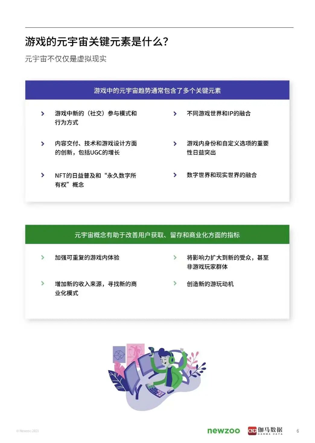 尽管在行业外的眼光中,元宇宙或许仍是一个无法实现的"遥远"概念,但事实是,我们已经生活在元宇宙的初始框架内。在我们尚未为之做好准备时,未来就已经降临。在这份报告中,希望能涵盖已近在咫尺的元宇宙机会以及元宇审概念对游戏生态系统的影响,主要探索目前被称为"元宇宙"的集合概念的直接价值所在。在报告的最后,还分享了对元宇宙概念演变的看法,主要是对游戏的影响。