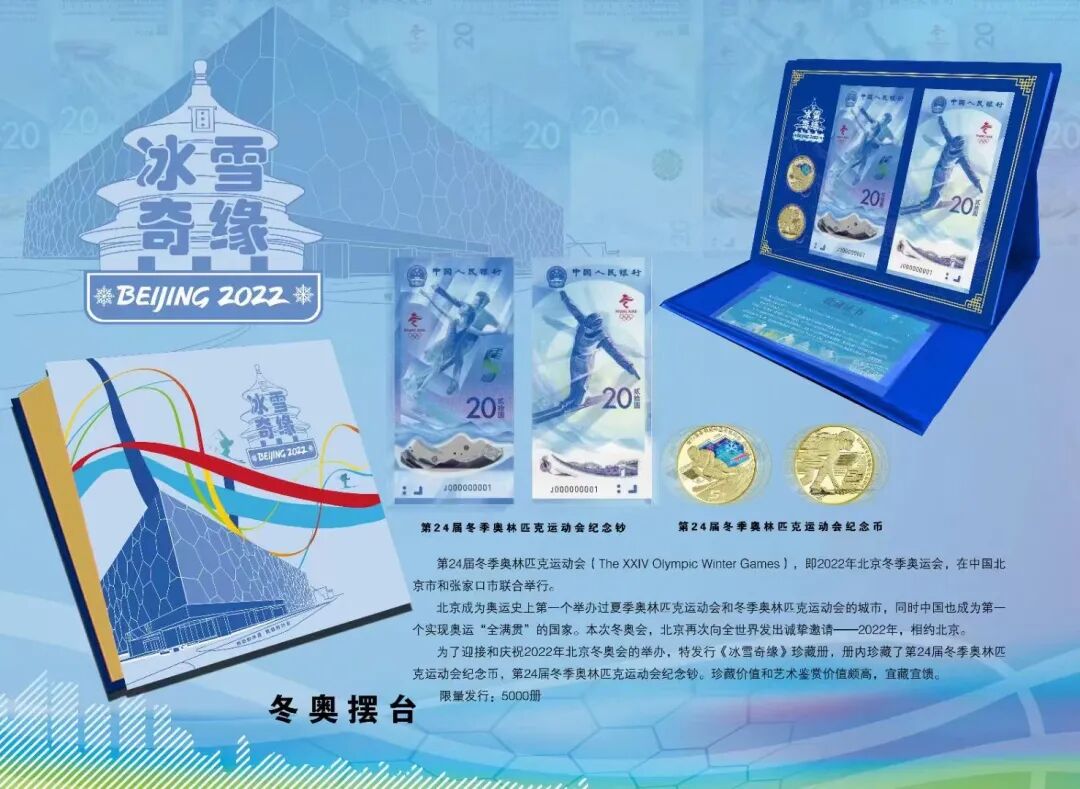一对冬奥会纪念币和一对冬奥纪念钞。