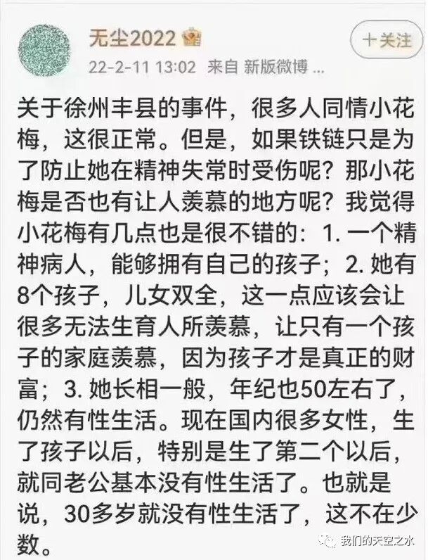 颜宁删了她的一位大学同学,因为这位同学说丰县事件明显是有人在带节奏。我的一个朋友说,这次事件是一个试金石,对此漠不关心的微信好友她都删了,不讨论这件事情的群她都退了。这个我也不赞同。不转发,不发声都可以理解,但至少不要像颜宁那个大学同学那样,自以为是,觉得自己无比光荣正确。人不是商品,不能被买卖,这应该是全人类基本的共识,结束奴隶制度这么多年了,女性的基本人Q还没有保障,还在受摧残。这么多人关注这个事件,站出来说话,是因为这涉及到一个人最基本的人Q,是因为每一个女性的人身安全都可能受到侵犯,是一个人的本能反应,而为它奔走呼吁,更是一个有良知的人应该做的,这需要人带节奏吗?我倒不觉得颜宁这位同学有多坏,只能说认知肤浅,被洗了脑了,没有自己的思考。同是清华的学子,差别怎么这么大呢?
