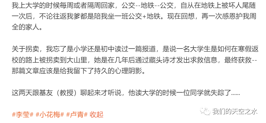 另一位就是郝景芳,作品《北京折叠》得雨果科幻奖的那位清华女生。这一次,她写了两篇长文,尤其是这篇《女性的觉醒势不可挡》,逻辑清晰又感人至深。景芳一直致力于推动偏远地区儿童的教育问题。前一阵,看到她发文,因为疫情,她正在创业的公司受到影响,现在,她是自己掏钱在给员工付工资,一直在苦撑着,这是一位真正的理想主义者,令人感动!