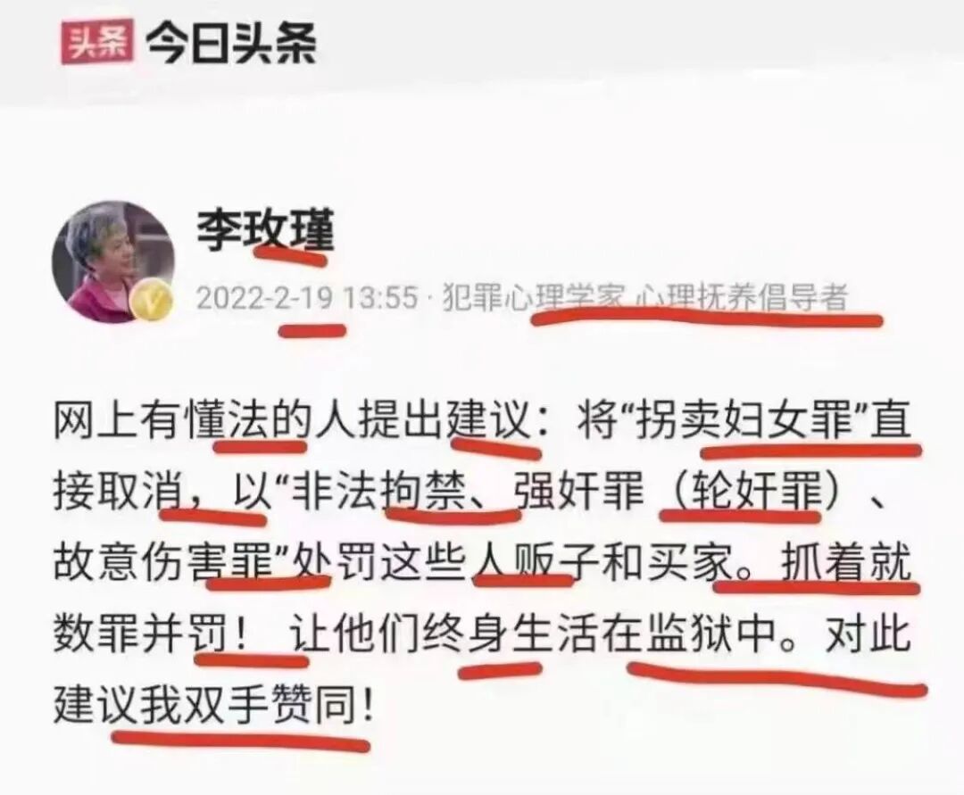 2月19号,犯罪心理学家李玫瑾教授在头条上发文“网上有懂法的人提出建议:“将’拐卖妇女罪’直接取消,以’非法拘禁、强奸罪(轮奸罪)、故意伤害罪’处罚这些人贩子和买家。抓着就数罪并罚!让他们终身生活在监狱中。对此建议我举双手赞同!”这是法律界良知人士与时俱进的正义呼声。
