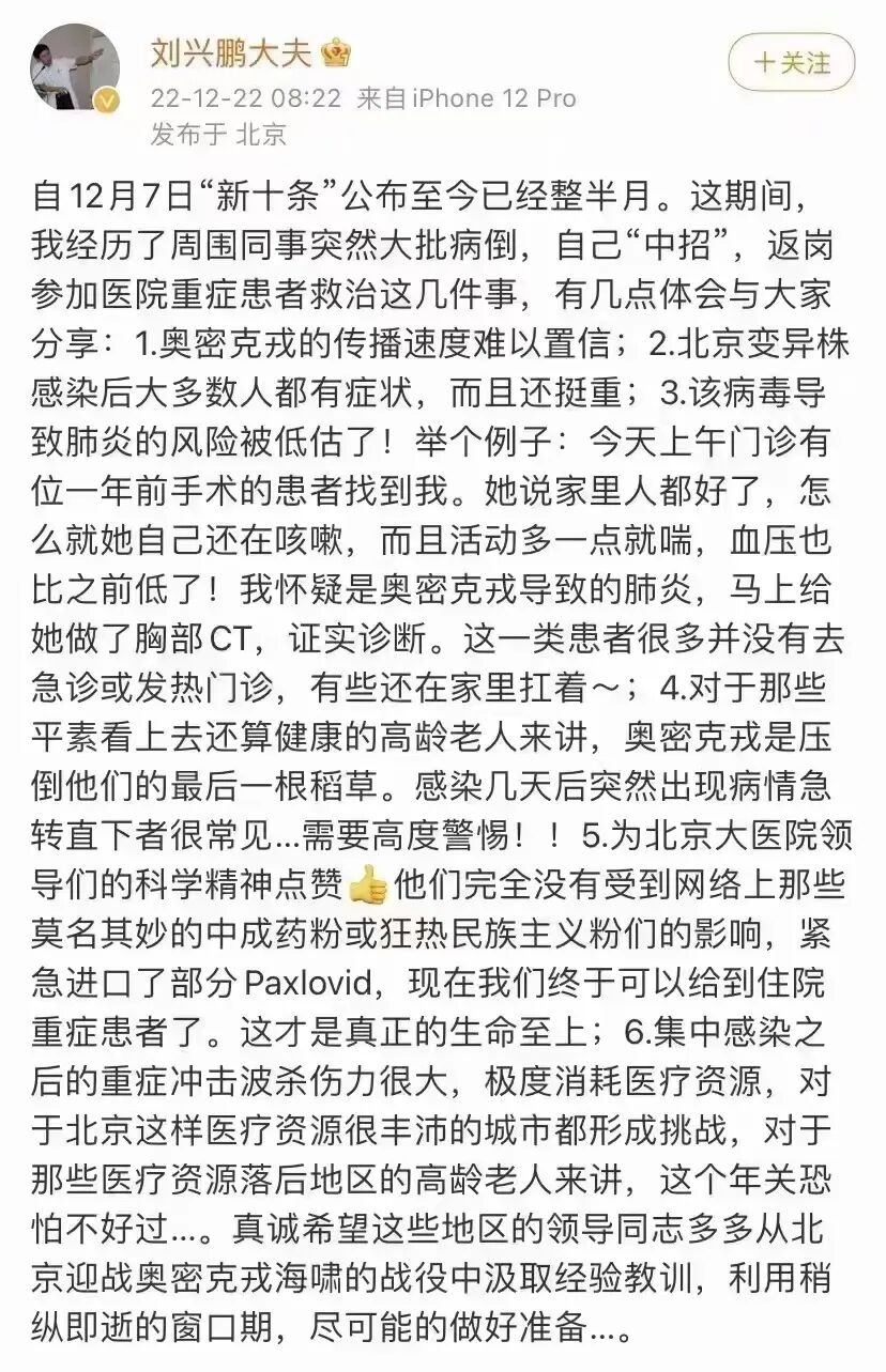 最近很多人开始质疑放开的政策。我一直是坚定的放开派,放开是明智的,事实上,放开是民心所向,也是大势所趋,如果放开得更早些恐怕还更好些。但的确,这一次放开后病毒蔓延速度之快也是超乎很多人预料的。网上广为传播的北京朝阳医院心脏中心副主任刘兴鹏医生说:“奥米克戎传播速度难以置信,该病毒导致肺炎的风险也被低估了。集中感染之后的重症冲击波杀伤力很大。“