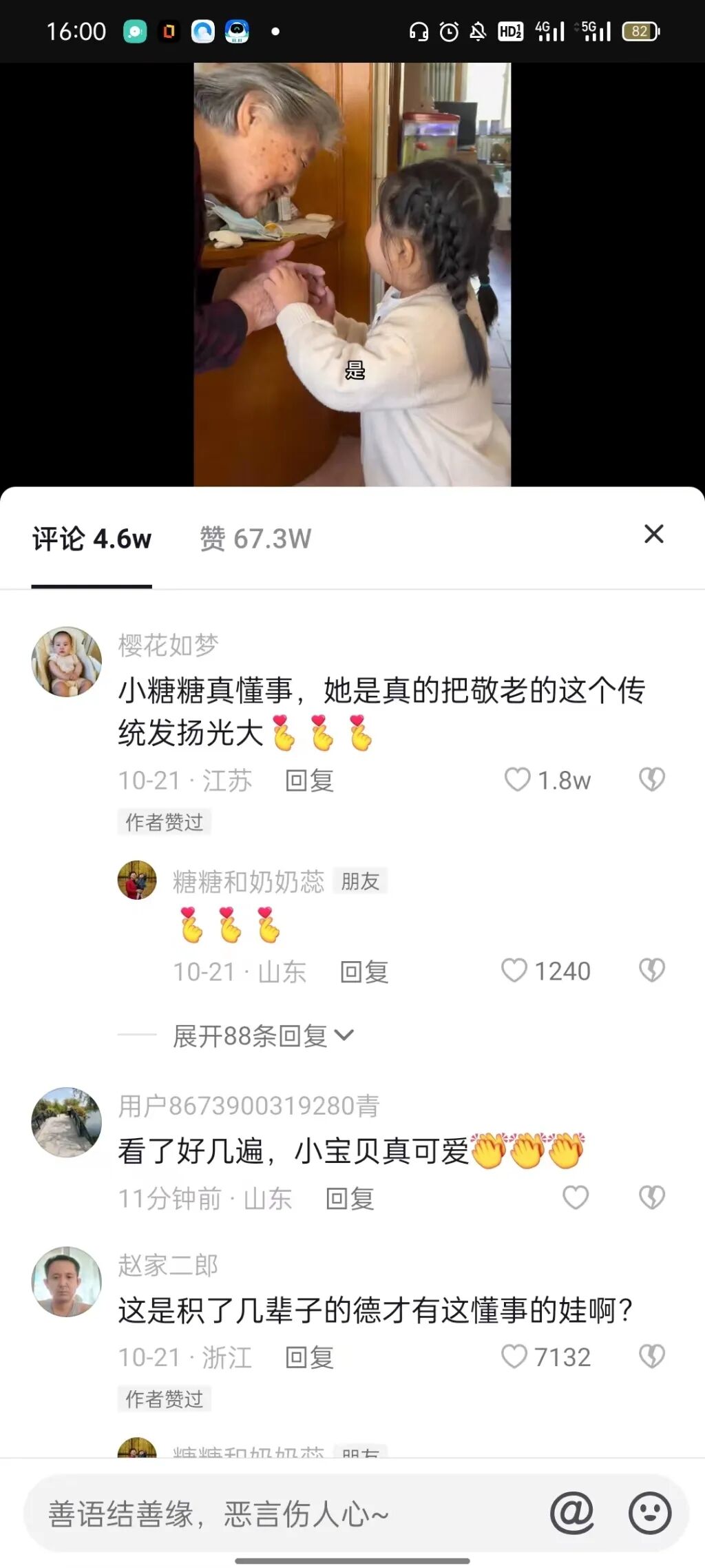 记者随即翻看了网友“糖糖和奶奶蕊”的其他视频。有的视频里,爷爷顶着寒风回家后,小女孩儿立马自动当起爷爷的“暖手宝”,暖心地替爷爷暖手暖脸。有的视频里,和太奶奶吃着花生,想起了太爷爷,“扬言”给太爷爷捎100斤肉。“心都化了”“天使应该就是这个模样吧”“孩子真懂事,把敬老这个传统发扬光大”视频里小女孩稚嫩的脸庞和懂事乖巧的说话语态引来网友留言夸赞。