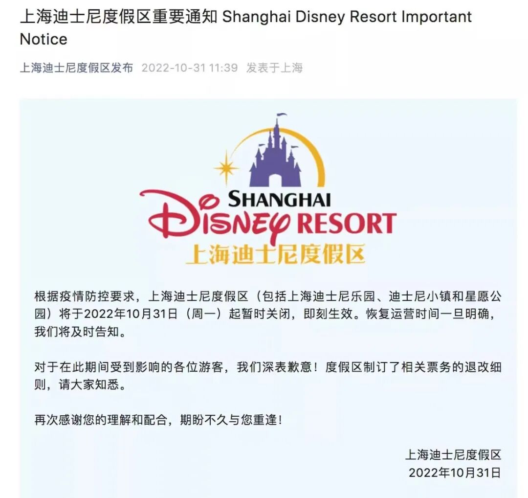 根据疫情防控要求,上海迪士尼度假区(包括上海迪士尼乐园、迪士尼小镇和星愿公园)将于2022年10月31日(周一)起暂时关闭,即刻生效。恢复运营时间一旦明确,我们将及时告知。