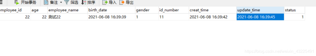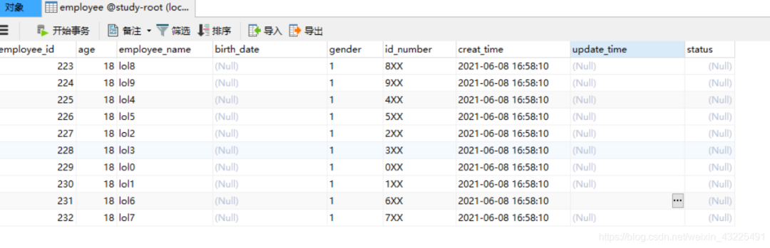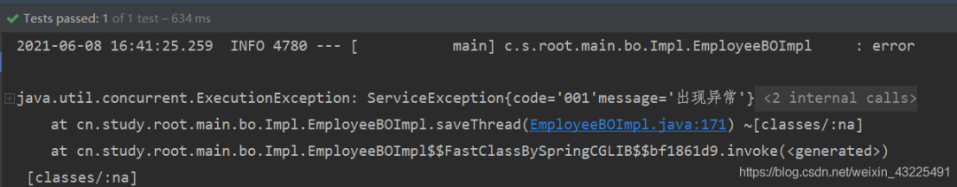 //测试用例(SpringRunner.class)(classes = { ThreadTest01.class, MainApplication.class})public class ThreadTest01 {private EmployeeBO employeeBO;/*** 测试多线程事务.* @throws InterruptedException*/public void MoreThreadTest2() throws InterruptedException {int size = 10;List<EmployeeDO> employeeDOList = new ArrayList<>(size);for (int i = 0; i<size;i++){EmployeeDO employeeDO = new EmployeeDO();employeeDO.setEmployeeName("lol"+i);employeeDO.setAge(18);employeeDO.setGender(1);employeeDO.setIdNumber(i+"XX");employeeDO.setCreatTime(Calendar.getInstance().getTime());employeeDOList.add(employeeDO);}try {employeeBO.saveThread(employeeDOList);System.out.println("添加成功");}catch (Exception e){e.printStackTrace();}}}
