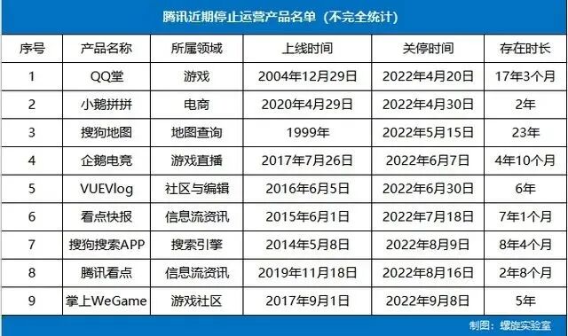 除了上述裁员降薪以及取消各类福利外,在过去的4个多月时间里,腾讯先后停止了9款产品的运营,既有软件也有游戏,甚至不乏运营了十几年的“古早”应用,而很多都承载了大家的青春回忆。