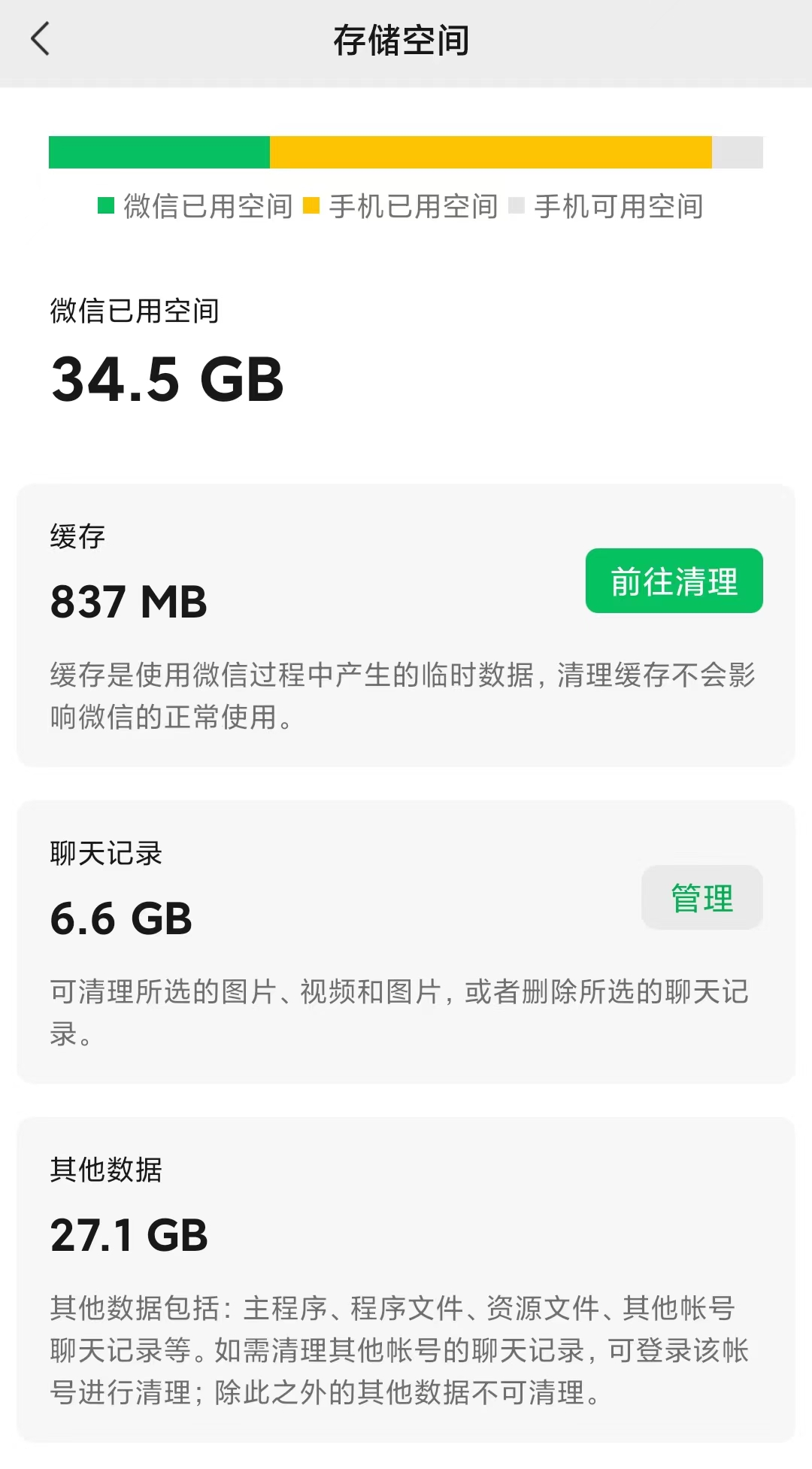 我们点开微信的存储空间功能,会发现微信将自己的数据分为三项:缓存,聊天记录和其他数据。