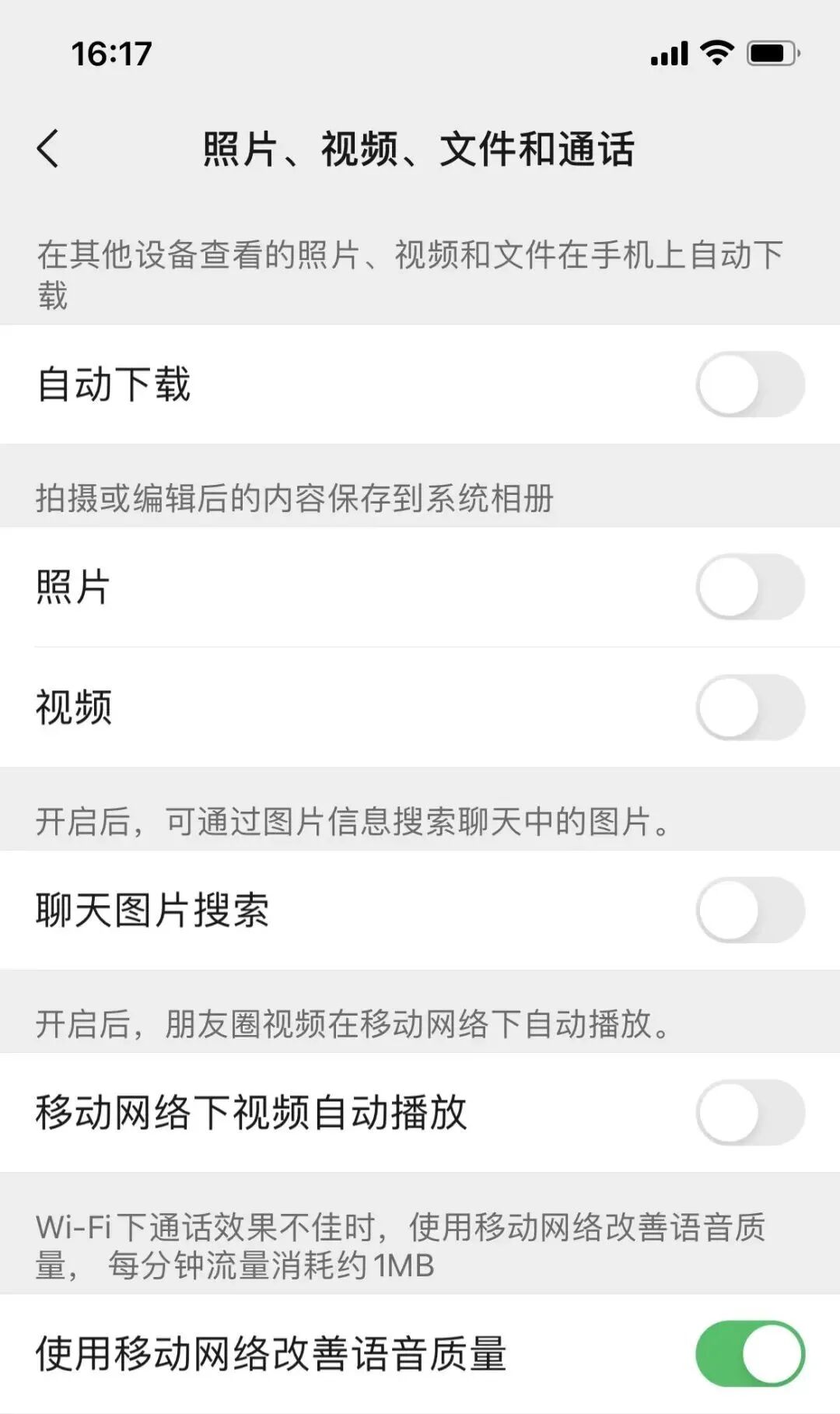 当在其他设备查看了内容时,阻止在手机上进行自动下载,同时也关闭将拍摄或编辑的内容保存到系统相册的功能。否则,你的手机微信记录里保存了一份,又在系统相册保存一份,再次占用了手机空间。