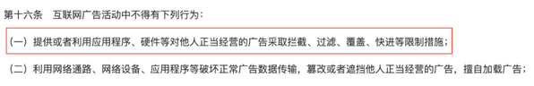 互联网广告活动中不得有下列行为:提供或者利用应用程序、硬件等对他人正当经营的广告采取拦截、过滤、覆盖、快进等限制措施。