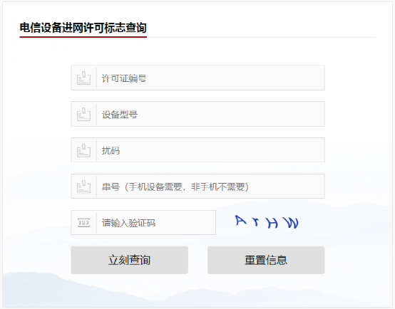 对进网许可标志上的信息进行查询验证。在界面依次输入许可证编号、设备型号、扰码和串号,即可获取查询结果。