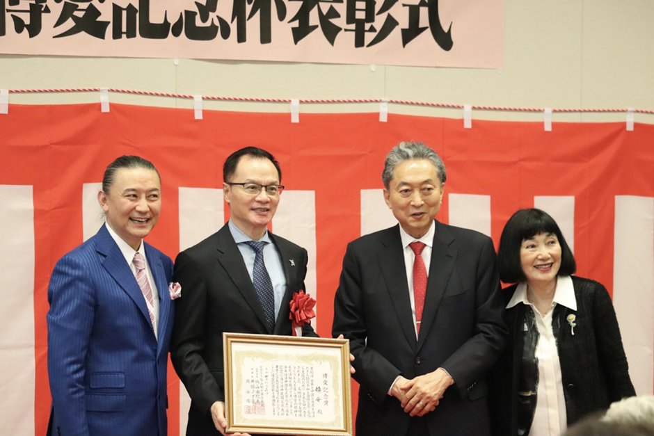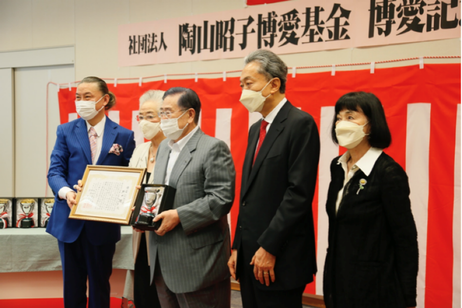 随后,日本前首相、陶山昭子博爱基金会名誉会长鸠山由纪夫上台致辞。鸠山由纪夫表示,自己及夫人与吴汝俊、陶山昭子夫妇是致力推动中日友好的伙伴。今天,在中日文化、经济、体育等方面做出巨大贡献的中日各届友好人士,因为陶山昭子博爱基金会举办的颁奖表彰仪式汇聚一堂,实乃一大幸事。今后,他将与夫人一道,继续秉承中日友好宗旨,尽最大努力推动民间友好交流。