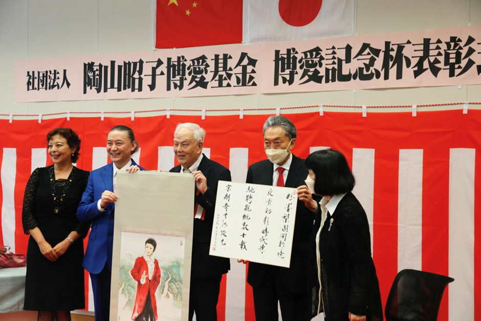 其后,日本华文教育协会会长颜安、日中协会理事长濑野清水等为中日文化交流和友好发展做出贡献的嘉宾代表,从鸠山由纪夫及夫人手中接过表彰他们贡献的纪念奖状。