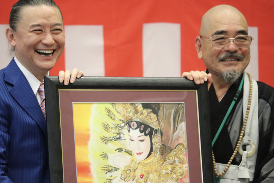 接着,黄檗宗日中友好交流委员会书记长内藤香林将亲手绘制的油画作品《千手观音》增设给吴汝俊,作品根据吴汝俊扮演的角色创作。
