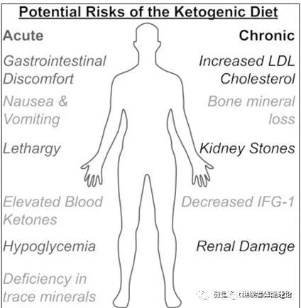 长期生酮饮食易造成:低密度脂蛋白胆固醇增加(和造成高血脂及动脉粥样硬化正相关),骨矿物质流失,肾结石,胰岛素样生长因子1(IGF-1)减少,肾损伤。